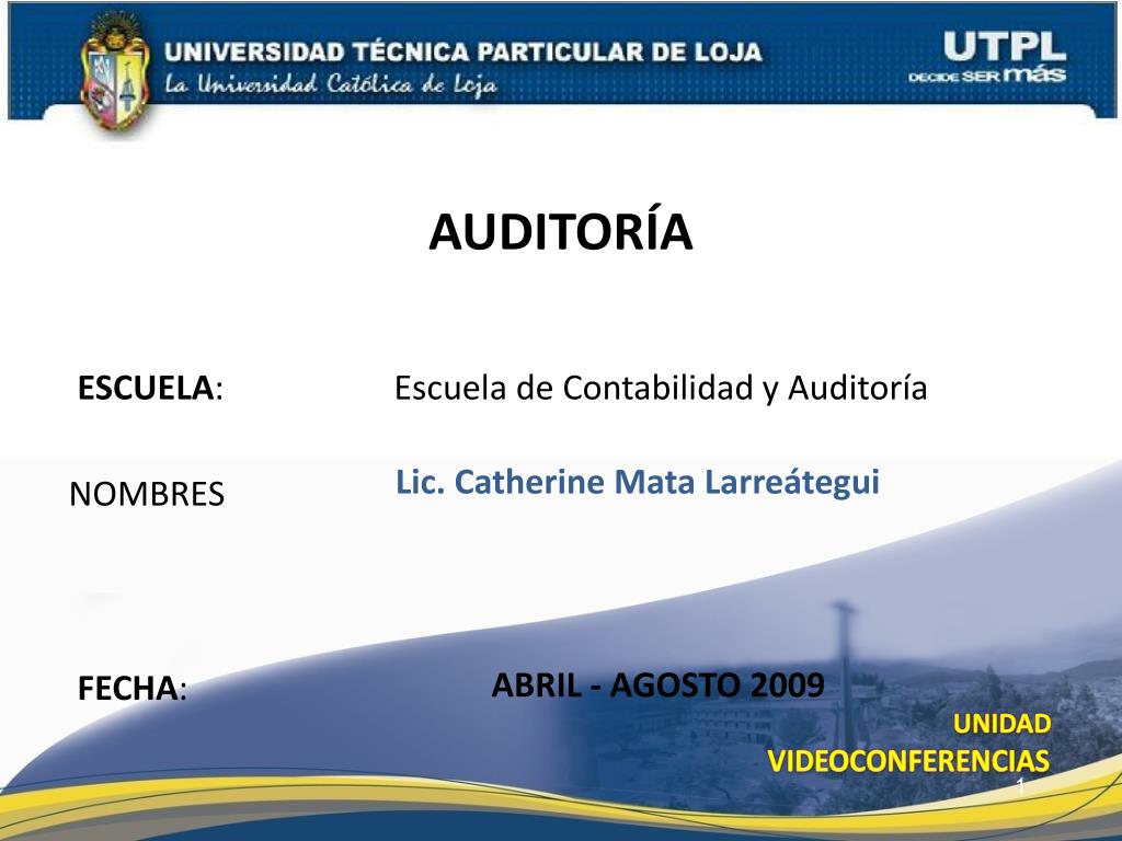 AUDITORÍA ESCUELA: Escuela de Contabilidad y Auditoría Lic. Catherine Mata Larreátegui NOMBRES ABRIL - AGOSTO 2009 FECHA: