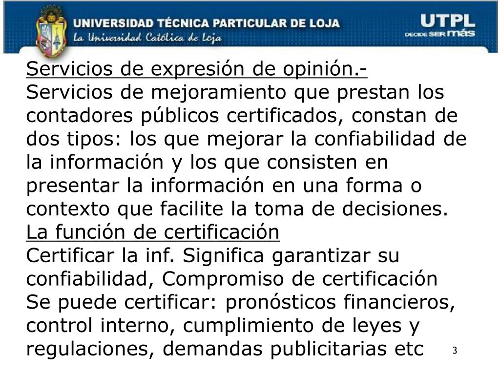 Servicios de expresión de opinión.- • Servicios de mejoramiento que prestan los contadores públicos certificados, constan de dos tipos: los que mejorar la confiabilidad de la información y los que consisten en presentar la información en una forma o contexto que facilite la toma de decisiones. • La función de certificación • Certificar la inf. Significa garantizar su confiabilidad, Compromiso de certificación • Se puede certificar: pronósticos financieros, control interno, cumplimiento de leyes y regulaciones, demandas publicitarias etc