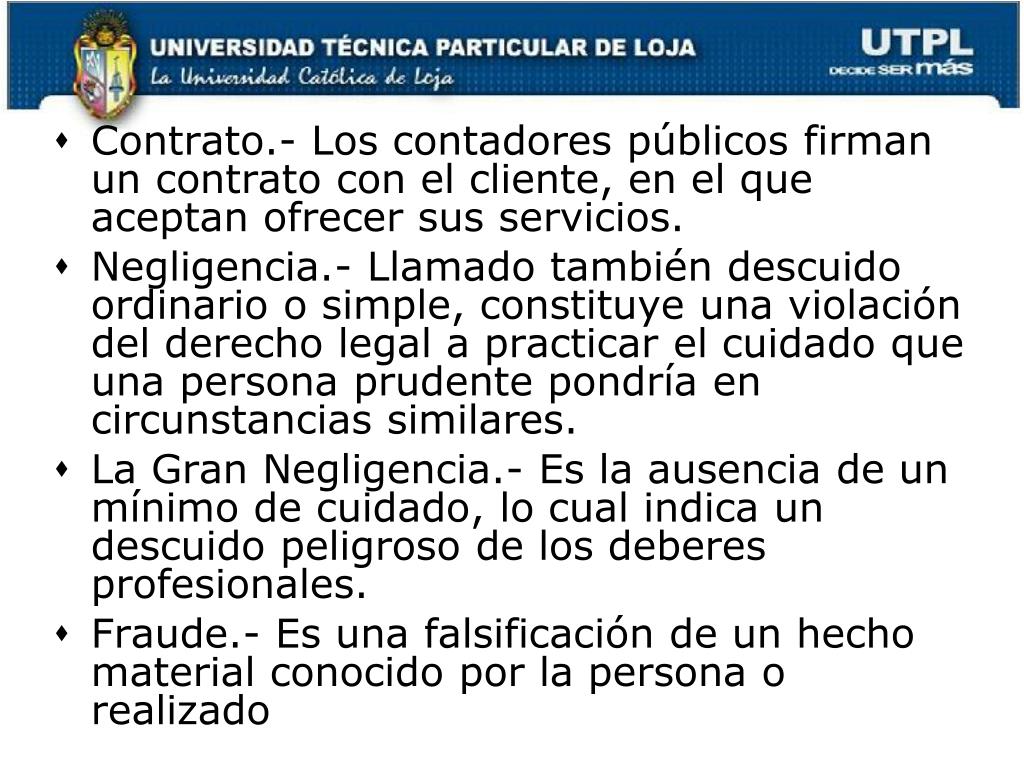 Contrato.- Los contadores públicos firman un contrato con el cliente, en el que aceptan ofrecer sus servicios. • Negligencia.- Llamado también descuido ordinario o simple, constituye una violación del derecho legal a practicar el cuidado que una persona prudente pondría en circunstancias similares. • La Gran Negligencia.- Es la ausencia de un mínimo de cuidado, lo cual indica un descuido peligroso de los deberes profesionales. • Fraude.- Es una falsificación de un hecho material conocido por la persona o realizado