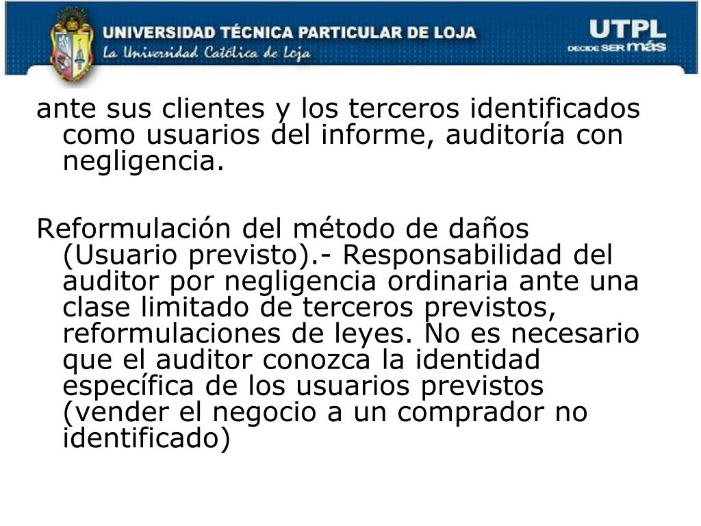 ante sus clientes y los terceros identificados como usuarios del informe, auditoría con negligencia. Reformulación del método de daños (Usuario previsto).- Responsabilidad del auditor por negligencia ordinaria ante una clase limitado de terceros previstos, reformulaciones de leyes. No es necesario que el auditor conozca la identidad específica de los usuarios previstos (vender el negocio a un comprador no identificado)