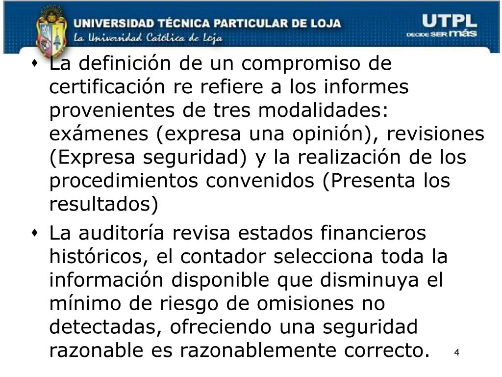 La definición de un compromiso de certificación re refiere a los informes provenientes de tres modalidades: exámenes (expresa una opinión), revisiones (Expresa seguridad) y la realización de los procedimientos convenidos (Presenta los resultados) • La auditoría revisa estados financieros históricos, el contador selecciona toda la información disponible que disminuya el mínimo de riesgo de omisiones no detectadas, ofreciendo una seguridad razonable es razonablemente correcto.