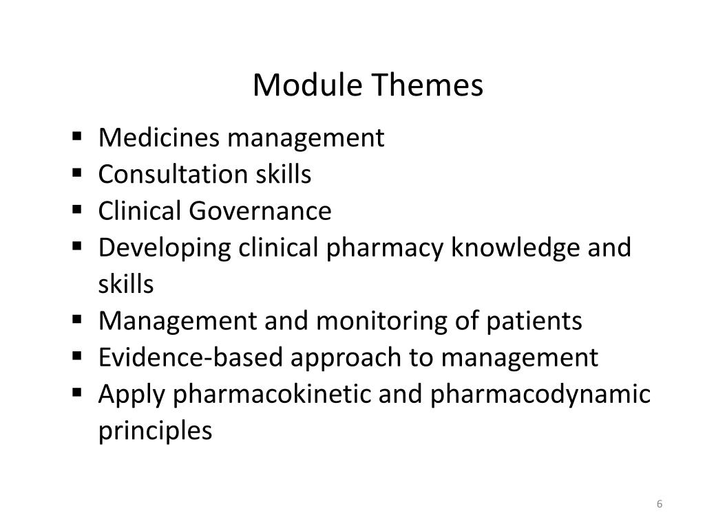 Module Themes • Medicines management • Consultation skills • Clinical Governance • Developing clinical pharmacy knowledge and skills • Management and monitoring of patients • Evidence-based approach to management • Apply pharmacokinetic and pharmacodynamic principles