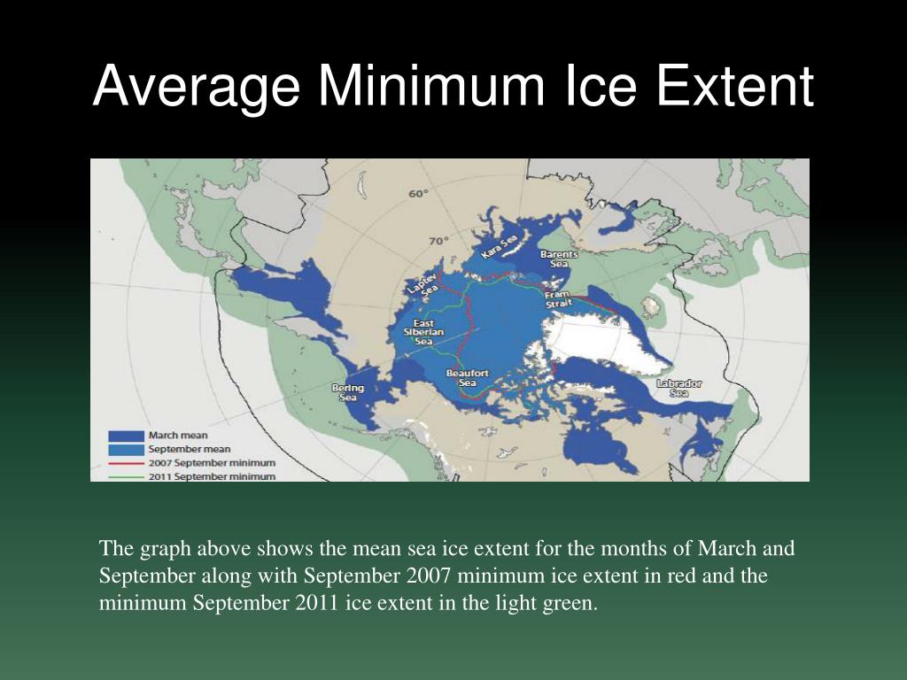 Average Minimum Ice Extent The graph above shows the mean sea ice extent for the months of March and September along with September 2007 minimum ice extent in red and the minimum September 2011 ice extent in the light green.