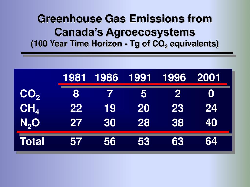 2001 1981 1986 1991 1996 64 63 Total 57 56 53 Greenhouse Gas Emissions from Canada’s Agroecosystems (100 Year Time Horizon - Tg of CO2 equivalents) 0 CO2 8 7 5 2 24 CH4 22 19 20 23 40 N2O 27 30 28 38