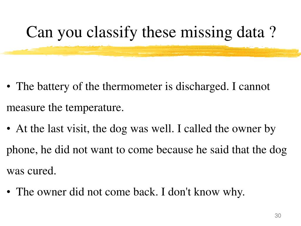 Can you classify these missing data ? • The battery of the thermometer is discharged. I cannot measure the temperature. • At the last visit, the dog was well. I called the owner by phone, he did not want to come because he said that the dog was cured. • The owner did not come back. I don't know why. 30