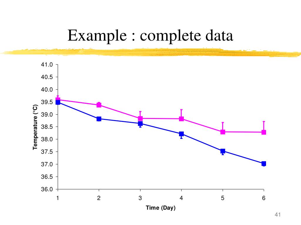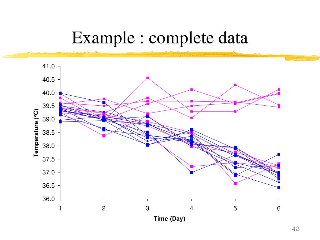 41 Temperature (°C) 38 Before treatment After treatment Example Efficacy of an antipyretic drug. Inclusion of 30 dogs with at least 39.5°C of temperature.