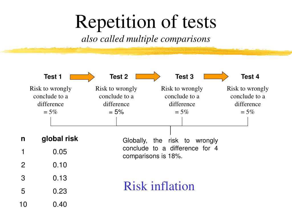 Test 1 Test 2 Test 3 Test 4 Risk to wrongly conclude to a difference= 5% Risk to wrongly conclude to a difference= 5% Risk to wrongly conclude to a difference= 5% Risk to wrongly conclude to a difference= 5% Repetition of testsalso called multiple comparisons n global risk 1 0.05 2 0.10 3 0.13 5 0.23 10 0.40 Globally, the risk to wrongly conclude to a difference for 4 comparisons is 18%. Risk inflation