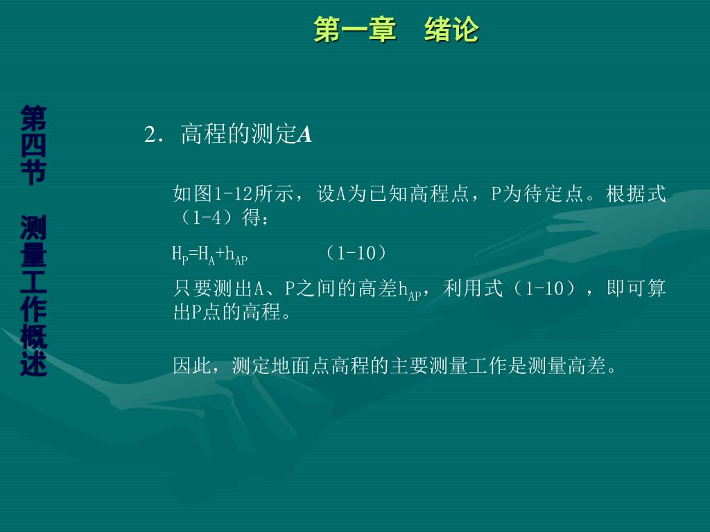 第一章 绪论 第四节 测量工作概述 2.高程的测定A 如图1-12所示,设A为已知高程点,P为待定点。根据式(1-4)得: HP=HA+hAP(1-10) 只要测出A、P之间的高差hAP,利用式(1-10),即可算出P点的高程。 因此,测定地面点高程的主要测量工作是测量高差。