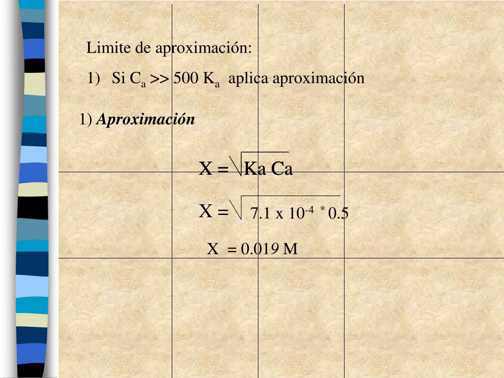 X = Ka Ca X = Ka Ca • Limite de aproximación: • Si Ca >> 500 Ka aplica aproximación 1) Aproximación X = 7.1 x 10-4 * 0.5 X = 0.019 M