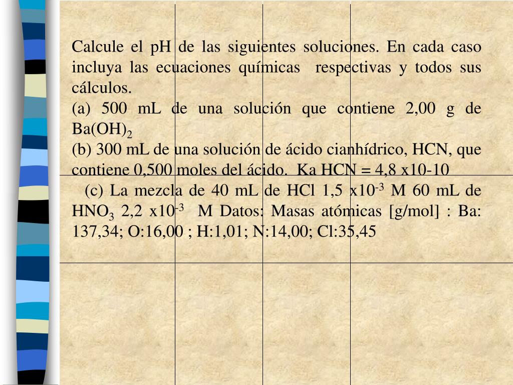 Calcule el pH de las siguientes soluciones. En cada caso incluya las ecuaciones químicas respectivas y todos sus cálculos. (a) 500 mL de una solución que contiene 2,00 g de Ba(OH)2 (b) 300 mL de una solución de ácido cianhídrico, HCN, que contiene 0,500 moles del ácido. Ka HCN = 4,8 x10-10 (c) La mezcla de 40 mL de HCl 1,5 x10-3 M 60 mL de HNO3 2,2 x10-3 M Datos: Masas atómicas [g/mol] : Ba: 137,34; O:16,00 ; H:1,01; N:14,00; Cl:35,45