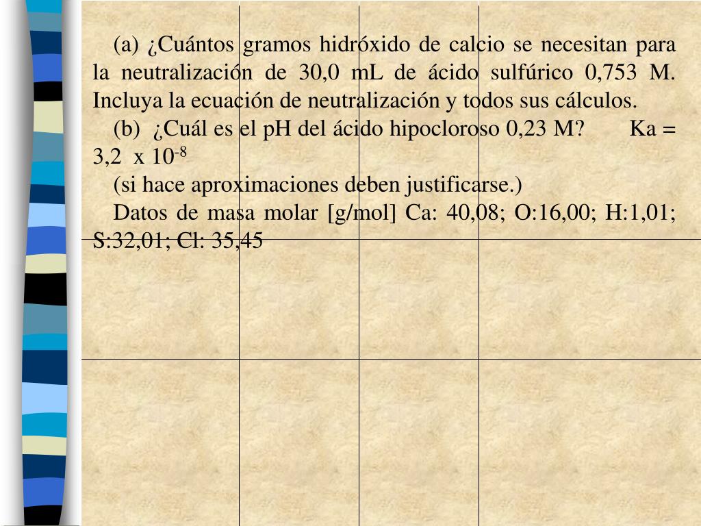 (a) ¿Cuántos gramos hidróxido de calcio se necesitan para la neutralización de 30,0 mL de ácido sulfúrico 0,753 M. Incluya la ecuación de neutralización y todos sus cálculos. (b) ¿Cuál es el pH del ácido hipocloroso 0,23 M? Ka = 3,2 x 10-8 (si hace aproximaciones deben justificarse.) Datos de masa molar [g/mol] Ca: 40,08; O:16,00; H:1,01; S:32,01; Cl: 35,45