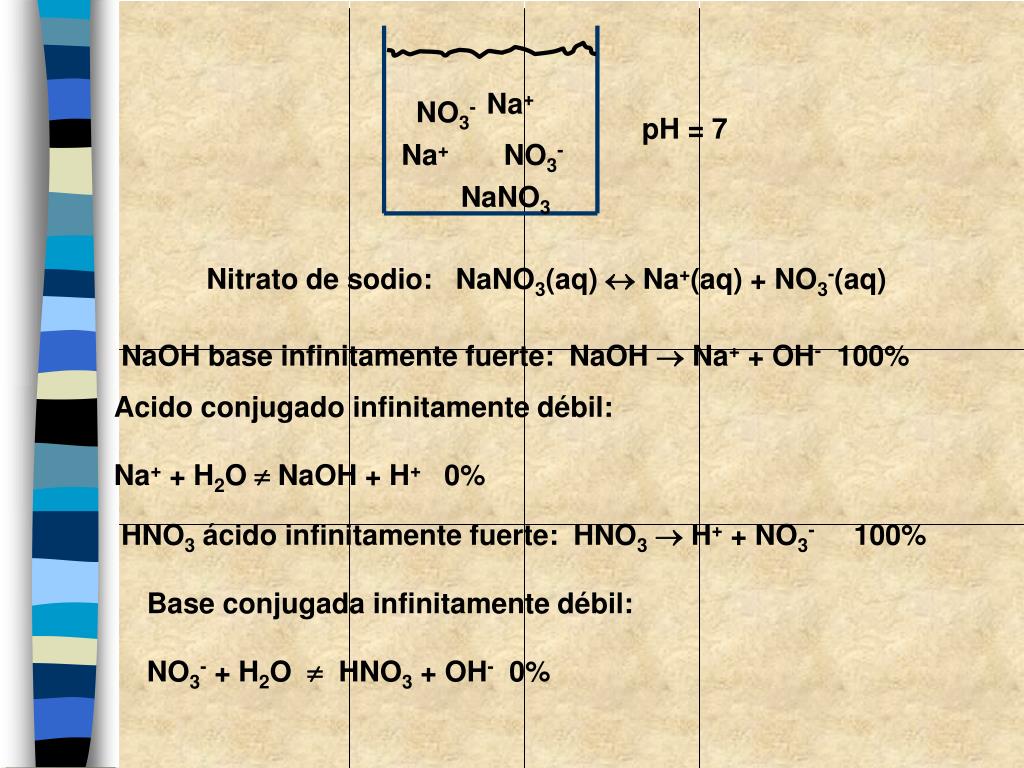 Na+ NO3- Na+ NO3- pH = 7 NaNO3 Nitrato de sodio: NaNO3(aq) Na+(aq) + NO3-(aq) NaOH base infinitamente fuerte: NaOH Na+ + OH- 100% Acido conjugado infinitamente débil: Na+ + H2O NaOH + H+ 0% HNO3 ácido infinitamente fuerte: HNO3 H+ + NO3- 100% Base conjugada infinitamente débil: NO3- + H2O HNO3 + OH- 0%