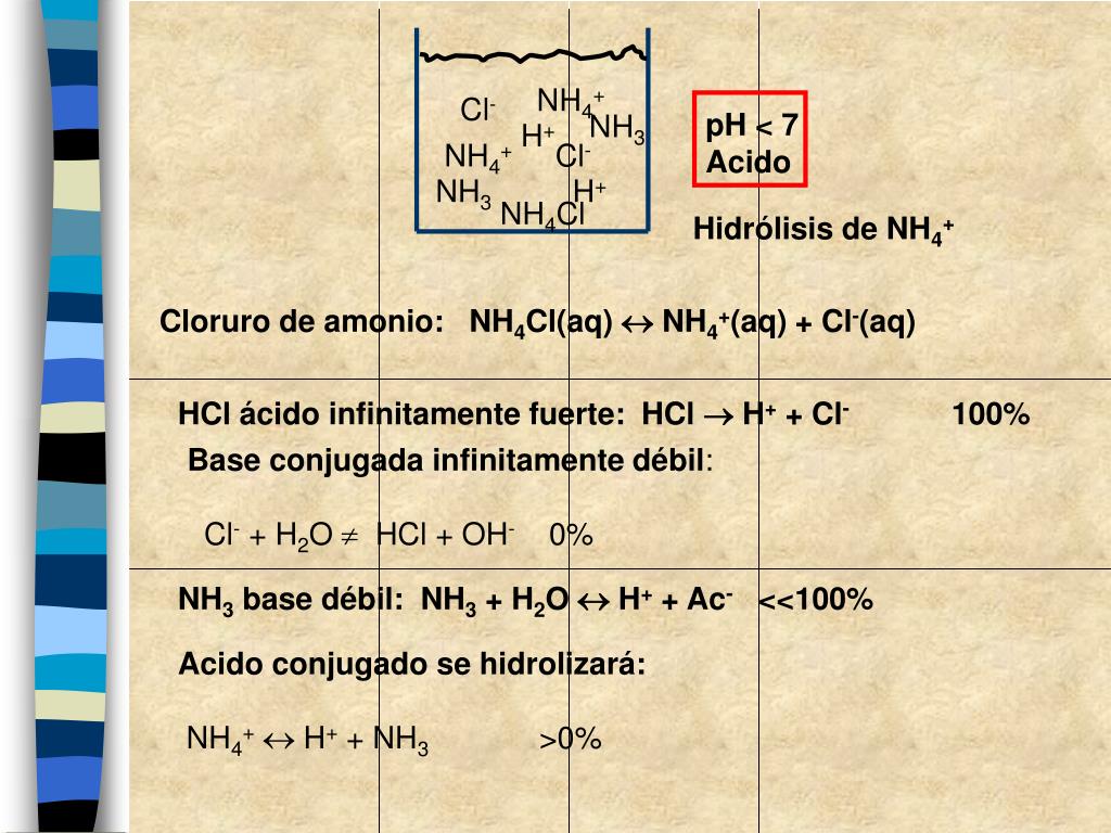 Sales en agua: Hidrólisis pH = 7 Agua pura: H2O H+ + OH- Cloruro de potasio: KCl(aq) K+(aq) + Cl-(aq) pH = 7 Nitrato de sodio: NaNO3(aq) Na+(aq) + NO3-(aq) pH = 7 pH > 7Básico Acetato de sodio: NaAc(aq) Na+(aq) + Ac-(aq) Cloruro de amonio: NH4Cl(aq) NH4+(aq) + Cl-(aq) pH < 7Acido