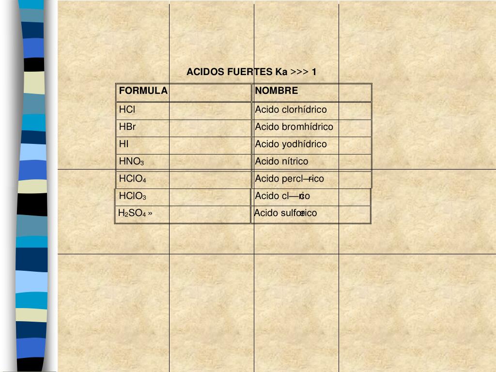 > > > A C ID OS FUER T E S Ka 1 FORMUL A NOMBR E H Cl Aci d o clo r hídri c o H Br Aci d o b ro mhí d rico HI Aci d o yo d hídri c o HN O Aci d o nítrico 3 H C l O Aci d o p e rcl— r ico 4 H C l O Aci d o cl—ri c o 3 H S O » Aci d o sulfœ r ico 2 4