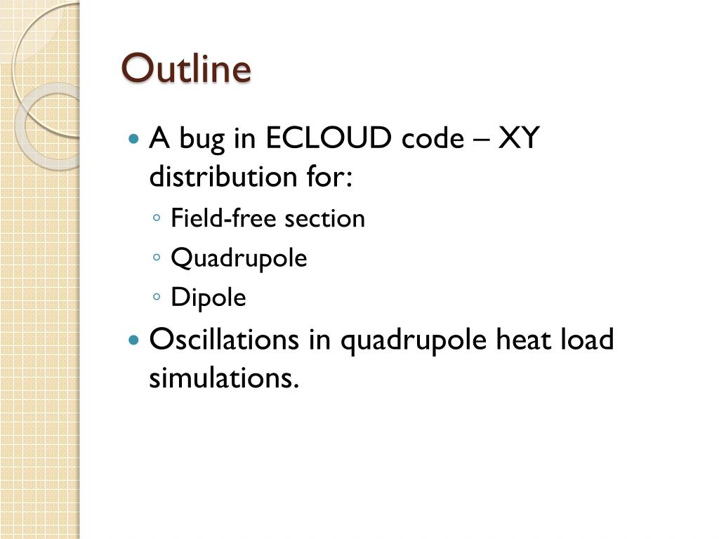 Outline • A bug in ECLOUD code – XY distribution for: • Field-free section • Quadrupole • Dipole • Oscillations in quadrupole heat load simulations.