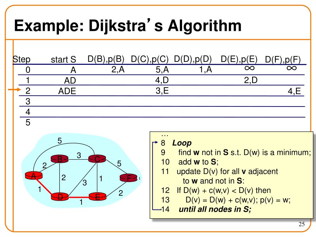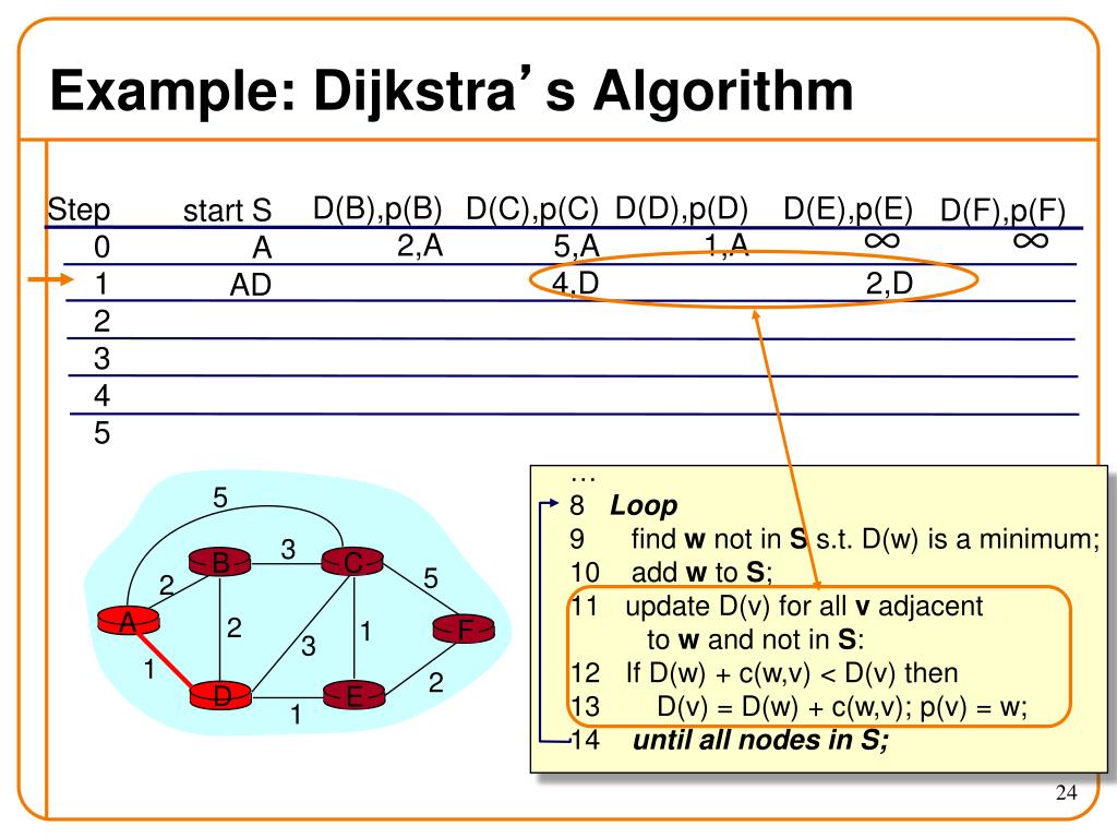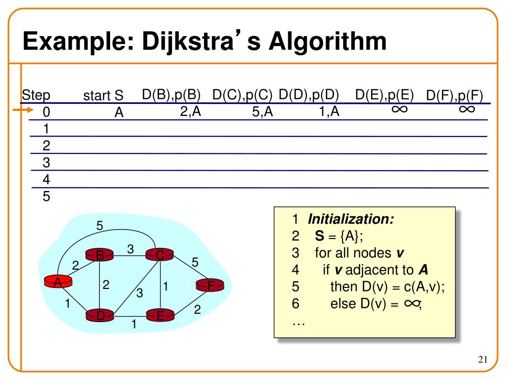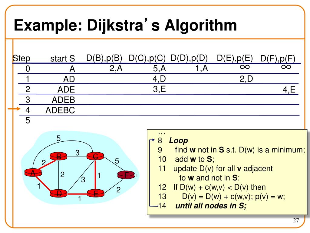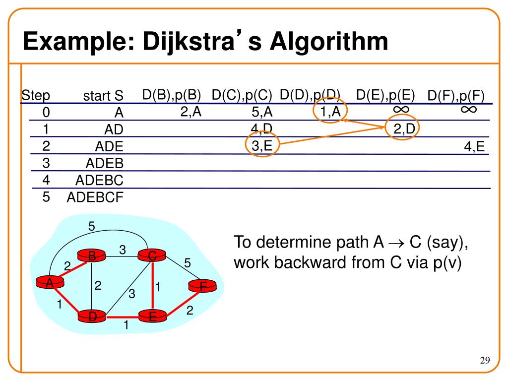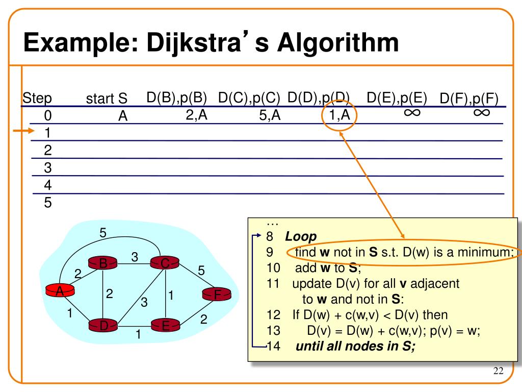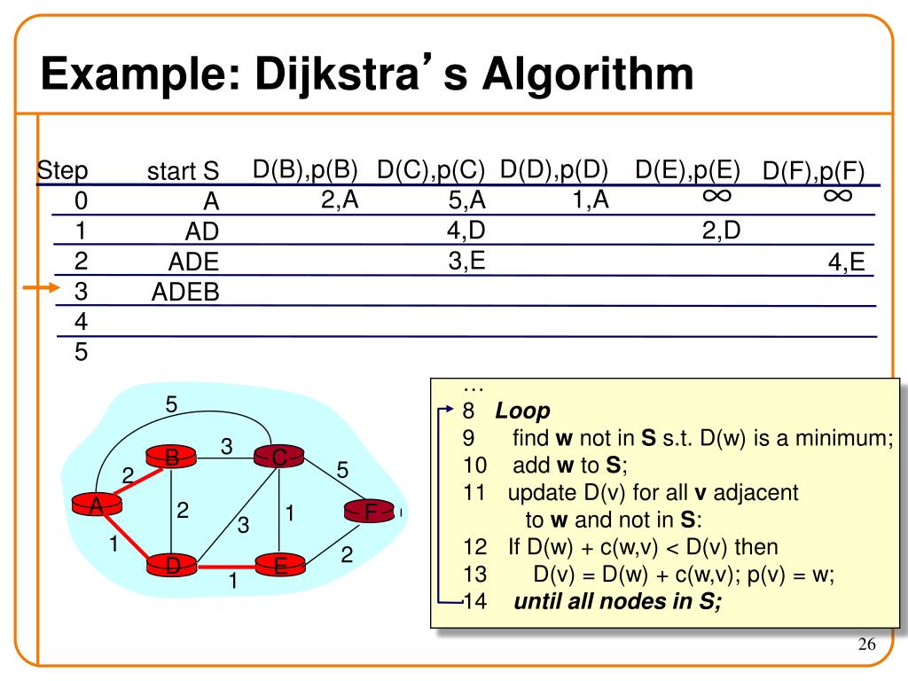 c(i,j): link cost from node i to j; cost infinite if not direct neighbors; ≥ 0 D(v): current value of cost of path from source to destination v p(v): predecessor node along path from source to v, that is next to v S: set of nodes whose least cost path definitively known D C A E B F 5 3 5 2 2 1 3 1 2 1 Notation Source