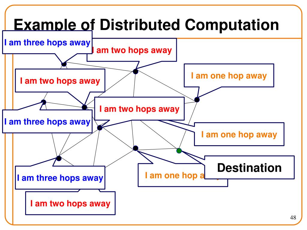 Example of Distributed Computation • I am three hops away • I am two hops away • I am one hop away • I am two hops away • I am two hops away • I am three hops away • I am one hop away • Destination • I am one hop away • I am three hops away • I am two hops away