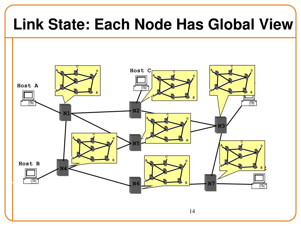 C C C C C C C A A A A A A A D D D D D D D Host C Host D Host A B B B B B B B E E E E E E E N2 N1 N3 N5 Host B Host E N4 N6 N7 Link State: Each Node Has Global View