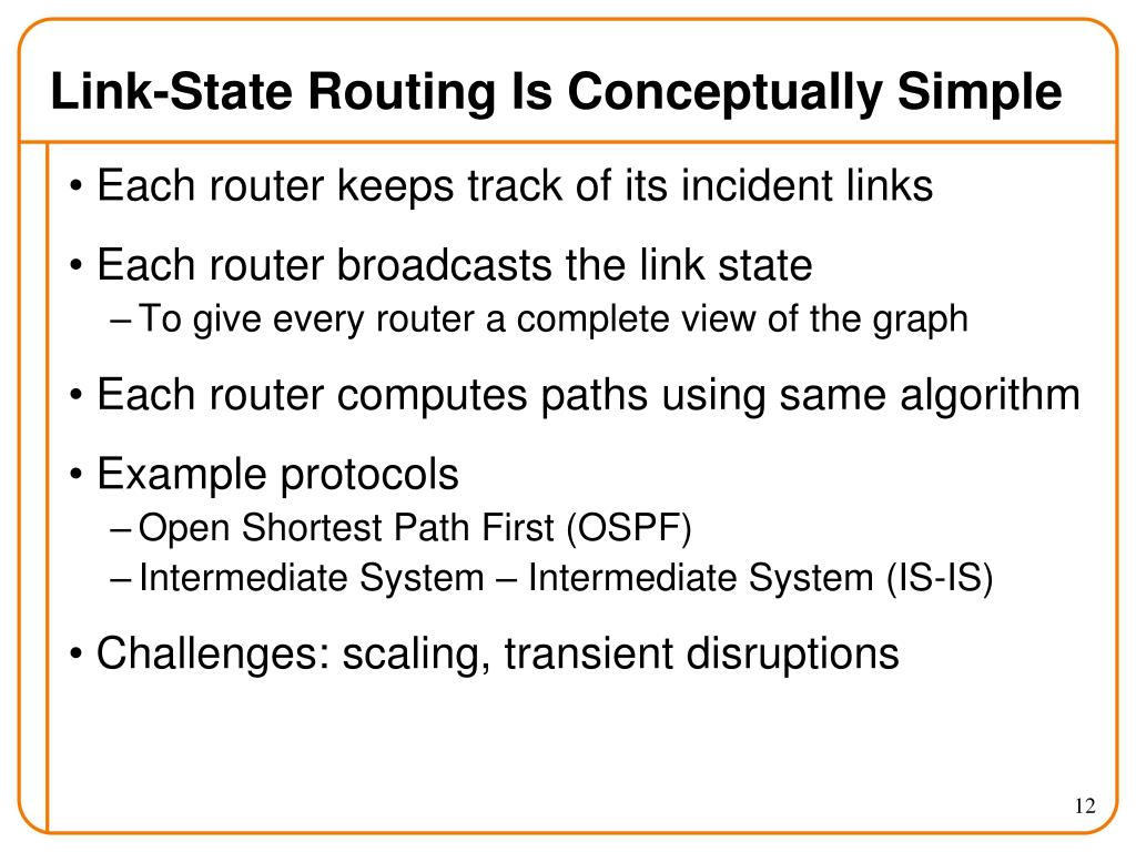 Link-State Routing Is Conceptually Simple • Each router keeps track of its incident links • Each router broadcasts the link state • To give every router a complete view of the graph • Each router computes paths using same algorithm • Example protocols • Open Shortest Path First (OSPF) • Intermediate System – Intermediate System (IS-IS) • Challenges: scaling, transient disruptions
