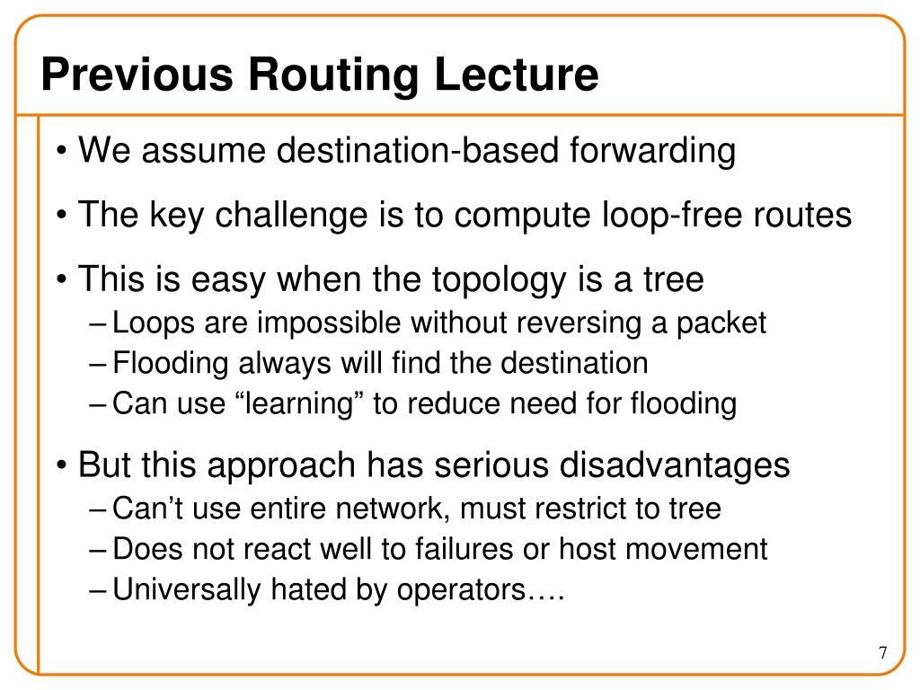 Previous Routing Lecture • We assume destination-based forwarding • The key challenge is to compute loop-free routes • This is easy when the topology is a tree • Loops are impossible without reversing a packet • Flooding always will find the destination • Can use “learning” to reduce need for flooding • But this approach has serious disadvantages • Can’t use entire network, must restrict to tree • Does not react well to failures or host movement • Universally hated by operators….
