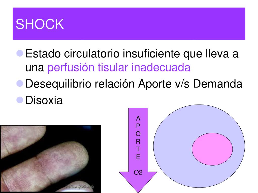 SHOCK • Estado circulatorio insuficiente que lleva a una perfusión tisular inadecuada • Desequilibrio relación Aporte v/s Demanda • Disoxia A P O R T E O2