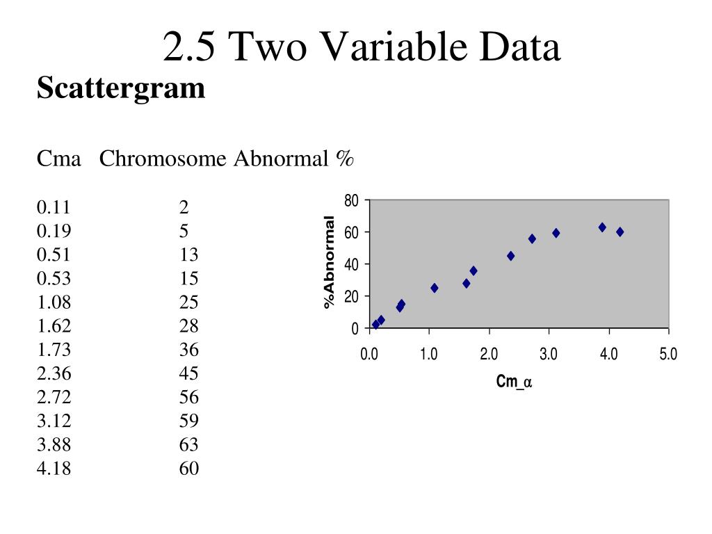 2.5 Two Variable Data Scattergram Cma Chromosome Abnormal % 0.11 2 0.19 5 0.51 13 0.53 15 1.08 25 1.62 28 1.73 36 2.36 45 2.72 56 3.12 59 3.88 63 4.18 60