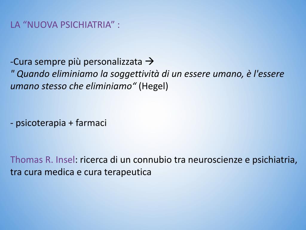LA “NUOVA PSICHIATRIA” : • Cura sempre più personalizzata • " Quando eliminiamo la soggettività di un essere umano, è l'essere umano stesso che eliminiamo“ (Hegel) • psicoterapia + farmaci • Thomas R. Insel: ricerca di un connubio tra neuroscienze e psichiatria, tra cura medica e cura terapeutica