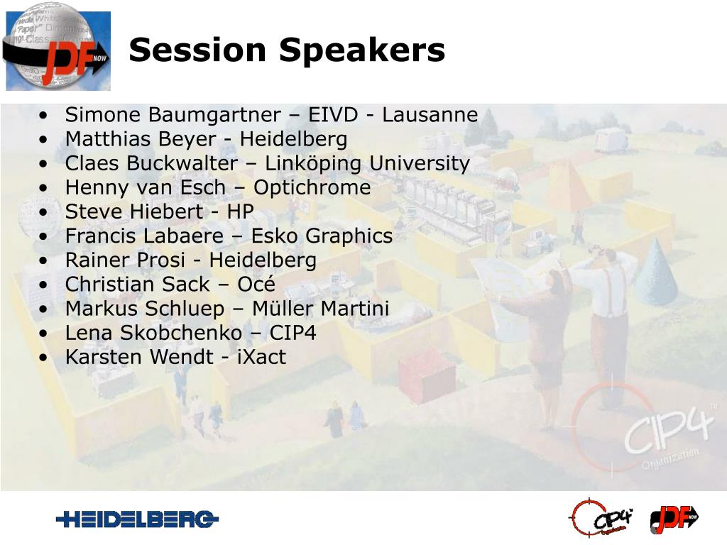 Session Speakers • Simone Baumgartner – EIVD - Lausanne • Matthias Beyer - Heidelberg • Claes Buckwalter – Linköping University • Henny van Esch – Optichrome • Steve Hiebert - HP • Francis Labaere – Esko Graphics • Rainer Prosi - Heidelberg • Christian Sack – Océ • Markus Schluep – Müller Martini • Lena Skobchenko – CIP4 • Karsten Wendt - iXact