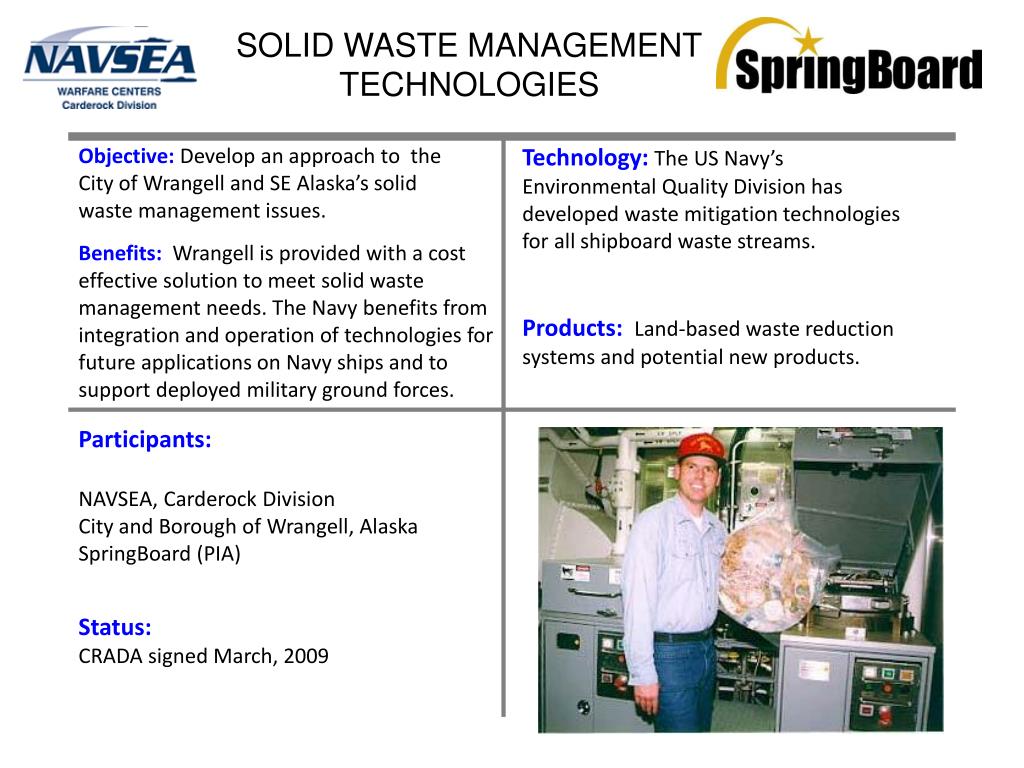SOLID WASTE MANAGEMENTTECHNOLOGIES Objective: Develop an approach to the City of Wrangell and SE Alaska’s solid waste management issues. Technology: The US Navy’s Environmental Quality Division has developed waste mitigation technologies for all shipboard waste streams. Benefits: Wrangell is provided with a cost effective solution to meet solid waste management needs. The Navy benefits from integration and operation of technologies for future applications on Navy ships and to support deployed military ground forces. Products:Land-based waste reduction systems and potential new products. Participants: NAVSEA, Carderock Division City and Borough of Wrangell, Alaska SpringBoard (PIA) Status: CRADA signed March, 2009