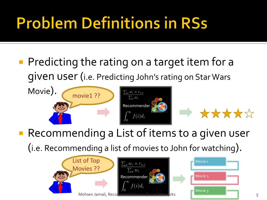 Problem Definitions in RSs • Predicting the rating on a target item for a given user (i.e. Predicting John’s rating on Star Wars Movie). • Recommending a List of items to a given user (i.e. Recommending a list of movies to John for watching). movie1 ?? Recommender List of Top Movies ?? Recommender Mohsen Jamali, Recommendation in Social Networks