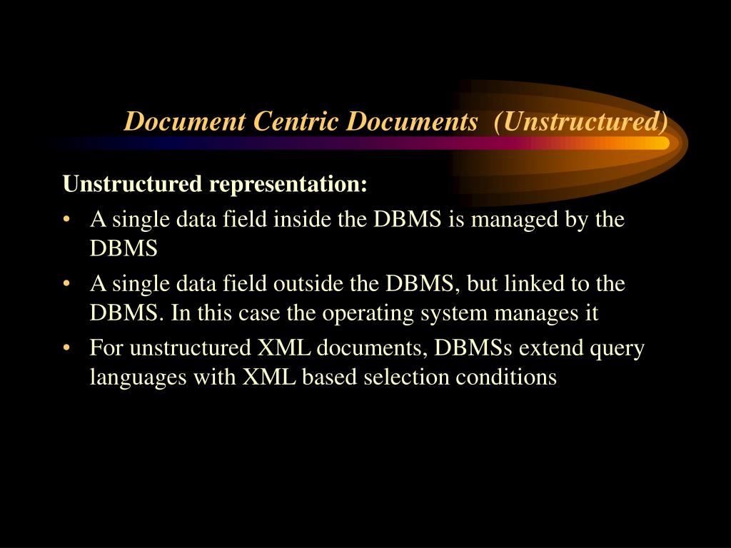 Document Centric Documents (Unstructured) Unstructured representation: • A single data field inside the DBMS is managed by the DBMS • A single data field outside the DBMS, but linked to the DBMS. In this case the operating system manages it • For unstructured XML documents, DBMSs extend query languages with XML based selection conditions