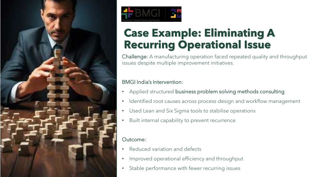 Case Example: Eliminating A Recurring Operational Issue Challenge: A manufacturing operation faced repeated quality and throughput issues despite multiple improvement initiatives. BMGI India’s Intervention: • Applied structured business problem solving methods consulting • Identified root causes across process design and workflow management • Used Lean and Six Sigma tools to stabilise operations • Built internal capability to prevent recurrence Outcome: • Reduced variation and defects • Improved operational efficiency and throughput • Stable performance with fewer recurring issues