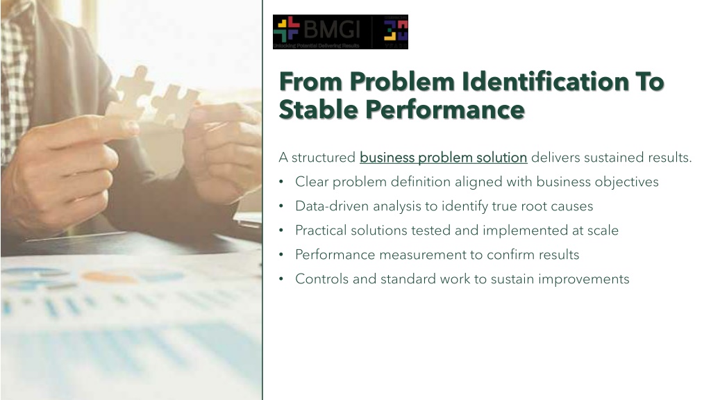 From Problem Identification To Stable Performance A structured business problem solution delivers sustained results. • Clear problem definition aligned with business objectives • Data-driven analysis to identify true root causes • Practical solutions tested and implemented at scale • Performance measurement to confirm results • Controls and standard work to sustain improvements