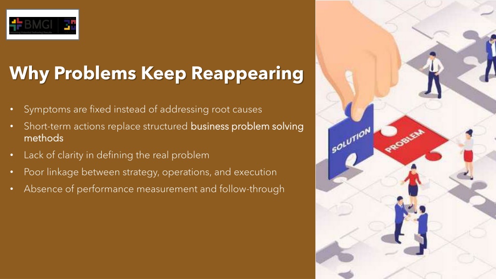 Why Problems Keep Reappearing Symptoms are fixed instead of addressing root causes Short-term actions replace structured business problem solving methods Lack of clarity in defining the real problem Poor linkage between strategy, operations, and execution Absence of performance measurement and follow-through