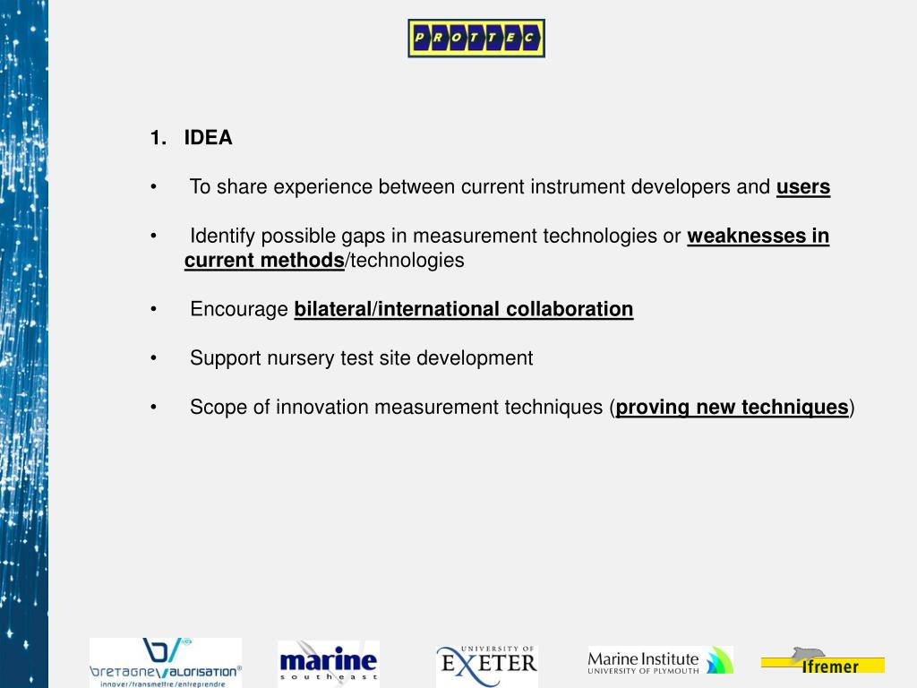 IDEA • To share experience between current instrument developers and users • Identify possible gaps in measurement technologies or weaknesses in current methods/technologies • Encourage bilateral/international collaboration • Support nursery test site development • Scope of innovation measurement techniques (proving new techniques)