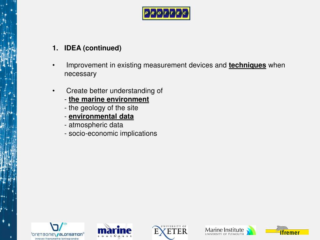 IDEA (continued) • Improvement in existing measurement devices and techniques when necessary • Create better understanding of • - the marine environment • - the geology of the site • - environmental data • - atmospheric data • - socio-economic implications