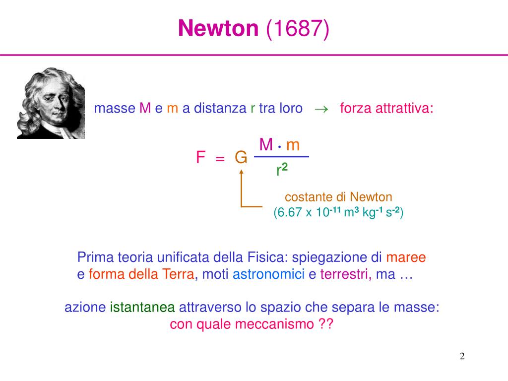 Newton (1687) M •m F =G r2 costante di Newton (6.67 x 10-11 m3kg-1 s-2) masseMema distanzartra loro forza attrattiva: Prima teoria unificata della Fisica: spiegazione dimaree e forma della Terra,motiastronomici eterrestri, ma … azioneistantanea attraverso lo spazioche separale masse: con quale meccanismo ??
