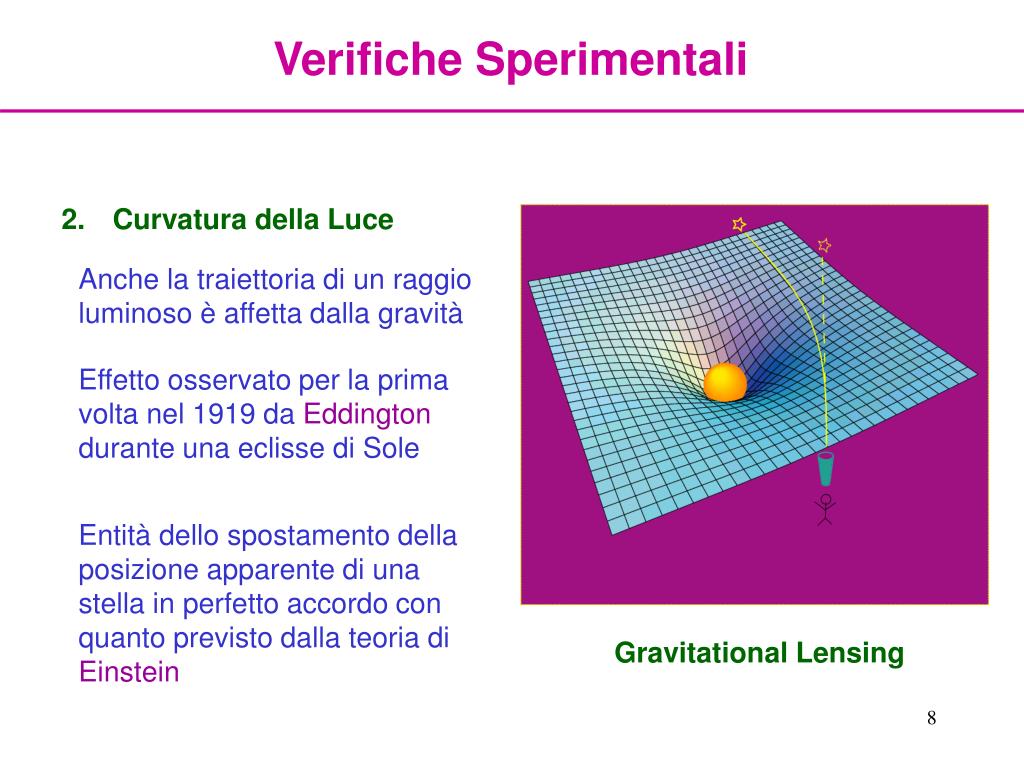 Verifiche Sperimentali • Curvatura della Luce Anche la traiettoria di un raggio luminoso è affetta dalla gravità Effetto osservato per la prima volta nel 1919 da Eddington durante una eclisse di Sole Entità dello spostamento della posizione apparente di una stella in perfetto accordo con quanto previsto dalla teoria di Einstein Gravitational Lensing