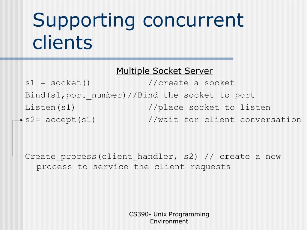 Supporting concurrent clients Multiple Socket Server s1 = socket() //create a socket Bind(s1,port_number)//Bind the socket to port Listen(s1) //place socket to listen s2= accept(s1) //wait for client conversation Create_process(client_handler, s2) // create a new process to service the client requests CS390- Unix Programming Environment