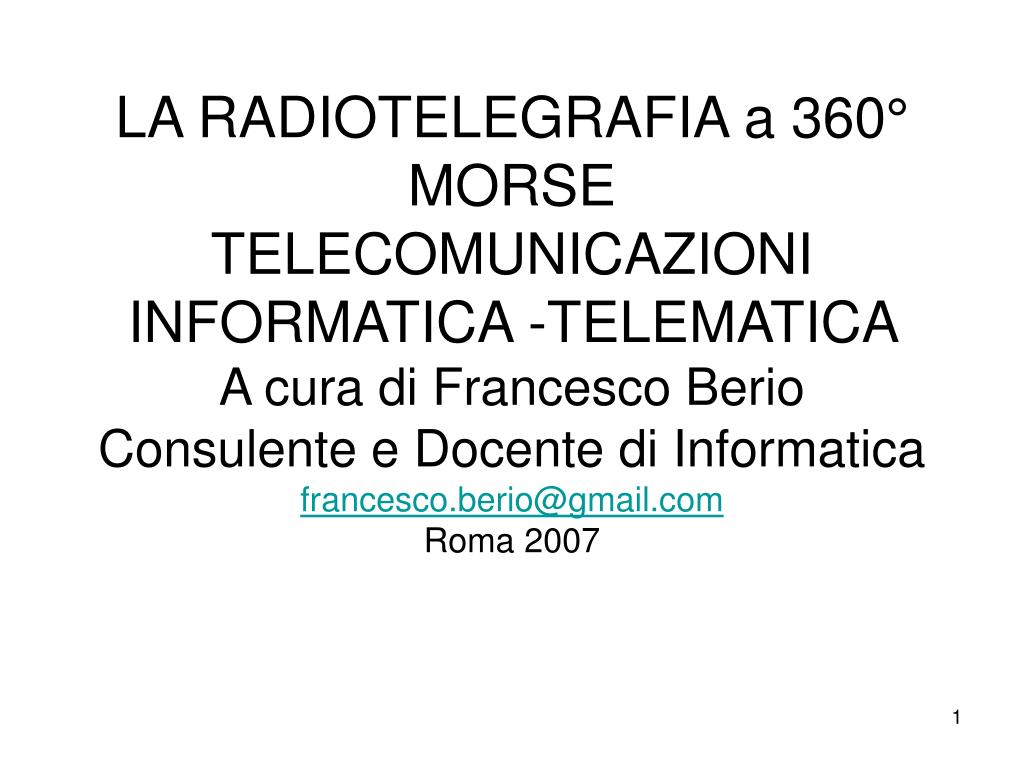 LA RADIOTELEGRAFIA a 360° MORSE TELECOMUNICAZIONI INFORMATICA -TELEMATICA A cura di Francesco Berio Consulente e Docente di Informatica francesco.berio@gmail.com Roma 2007. LA RADIOTELEGRAFIA a 360°.