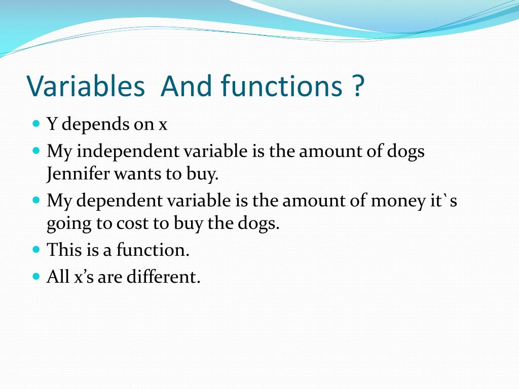 Variables And functions ? • Y depends on x • My independent variable is the amount of dogs Jennifer wants to buy. • My dependent variable is the amount of money it`s going to cost to buy the dogs. • This is a function. • All x’s are different.