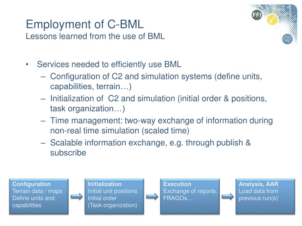 Employment of C-BMLLessons learned from the use of BML • Services needed to efficiently use BML • Configuration of C2 and simulation systems (define units, capabilities, terrain…) • Initialization of C2 and simulation (initial order & positions, task organization…) • Time management: two-way exchange of information during non-real time simulation (scaled time) • Scalable information exchange, e.g. through publish & subscribe Configuration Terrain data / maps Define units and capabilities Initialization Initial unit positions Initial order (Task organization) Execution Exchange of reports, FRAGOs… Analysis, AAR Load data from previous run(s)