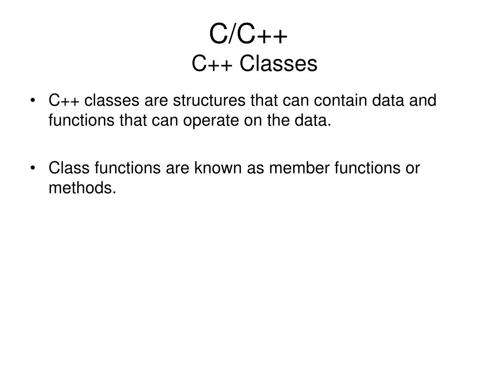 C/C++ C++ Classes • C++ classes are structures that can contain data and functions that can operate on the data. • Class functions are known as member functions or methods.
