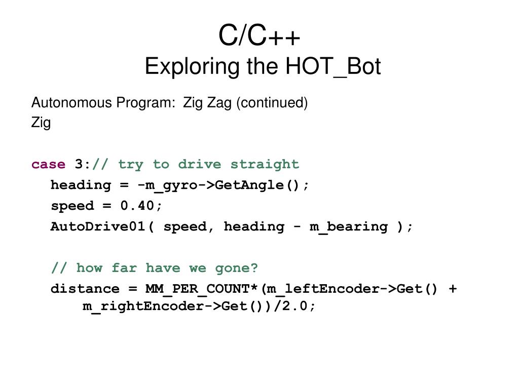 C/C++ Exploring the HOT_Bot Autonomous Program: Zig Zag (continued) Zig case 1:// try to drive straight heading = -m_gyro->GetAngle(); speed = 0.40; AutoDrive01( speed, heading - m_bearing ); // how far have we gone? distance = MM_PER_COUNT*(m_leftEncoder->Get() + m_rightEncoder->Get())/2.0;