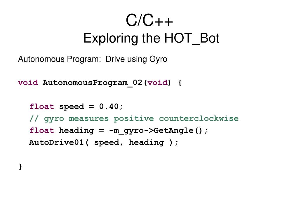 C/C++ Exploring the HOT_Bot Autonomous Program: Drive using Gyro void AutonomousProgram_02(void) { float speed = 0.40; // gyro measures positive counterclockwise float heading = -m_gyro->GetAngle(); AutoDrive01( speed, heading ); }