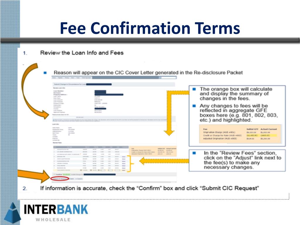 Review Process: Fee Confirmation Terms • After clicking “Confirm CIC”, Broker will be directed to a page • showing current fees and current Lock information. • Displays the current Pricing / Note Rate / Loan Parameters • Broker reviews, confirms and may also edit the fees entered on the loan • The adjustment to the fees cannot exceed certain tolerances defined in the GFE guidelines. • Once the Broker confirms the CIC request, the system performs • the following checks: • Did the APR increase or decrease by at least 0.125%? • If yes, then a new TIL is generated
