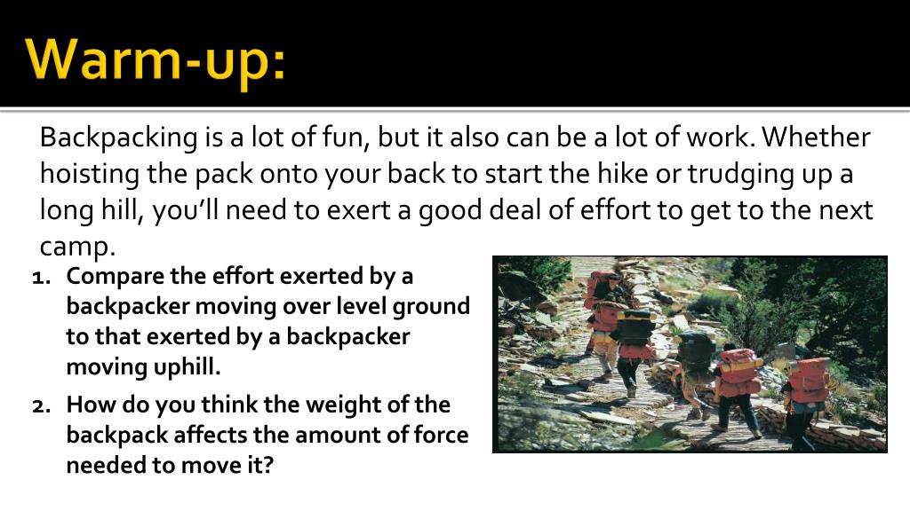 Warm-up: Backpacking is a lot of fun, but it also can be a lot of work. Whether hoisting the pack onto your back to start the hike or trudging up a long hill, you’ll need to exert a good deal of effort to get to the next camp. Compare the effort exerted by a backpacker moving over level ground to that exerted by a backpacker moving uphill. How do you think the weight of the backpack affects the amount of force needed to move it?