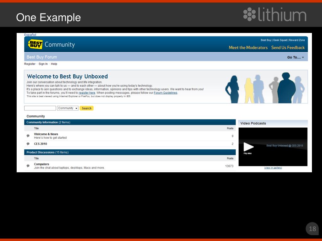 Reap the Rewards • FutureShop #1 electronics community in Canada. Creators won Best Buy’s $1MM Innovation Award. • TV land grows community size by 33% after moving to Lithium. • Introduces new product line based on community input. Increased units shipped by 1MM units with no increase in call center expense. • Pitney Bowes realizes hundreds of thousands of dollars in support savings within the first four weeks.