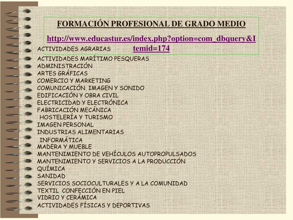 FORMACIÓN PROFESIONAL DE GRADO MEDIO http://www.educastur.es/index.php?option=com_dbquery&Itemid=174 ACTIVIDADES AGRARIAS ACTIVIDADES MARÍTIMO PESQUERAS ADMINISTRACIÓN ARTES GRÁFICAS COMERCIO Y MARKETING COMUNICACIÓN, IMAGEN Y SONIDO EDIFICACIÓN Y OBRA CIVIL ELECTRICIDAD Y ELECTRÓNICA FABRICACIÓN MECÁNICA HOSTELERÍA Y TURISMO IMAGEN PERSONAL INDUSTRIAS ALIMENTARIAS INFORMÁTICA MADERA Y MUEBLE MANTENIMIENTO DE VEHÍCULOS AUTOPROPULSADOS MANTENIMIENTO Y SERVICIOS A LA PRODUCCIÓN QUÍMICA SANIDAD SERVICIOS SOCIOCULTURALES Y A LA COMUNIDAD TEXTIL, CONFECCIÓN EN PIEL VIDRIO Y CERÁMICA ACTIVIDADES FÍSICAS Y DEPORTIVAS