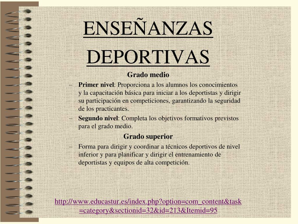 ENSEÑANZAS DEPORTIVAS Grado medio Primer nivel: Proporciona a los alumnos los conocimientos y la capacitación básica para iniciar a los deportistas y dirigir su participación en competiciones, garantizando la seguridad de los practicantes. Segundo nivel: Completa los objetivos formativos previstos para el grado medio. Grado superior Forma para dirigir y coordinar a técnicos deportivos de nivel inferior y para planificar y dirigir el entrenamiento de deportistas y equipos de alta competición. http://www.educastur.es/index.php?option=com_content&task=category§ionid=32&id=213&Itemid=95